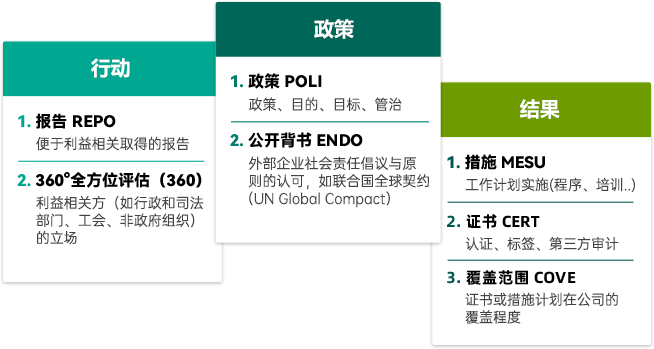 EcoVadis遵循PDCA(plan–do–check–act)的可持续发展管理逻辑,形成了独特的以“政策 - 行动 - 结果”为导向的评分体系,即针对每项指标这三个维度进行打分。