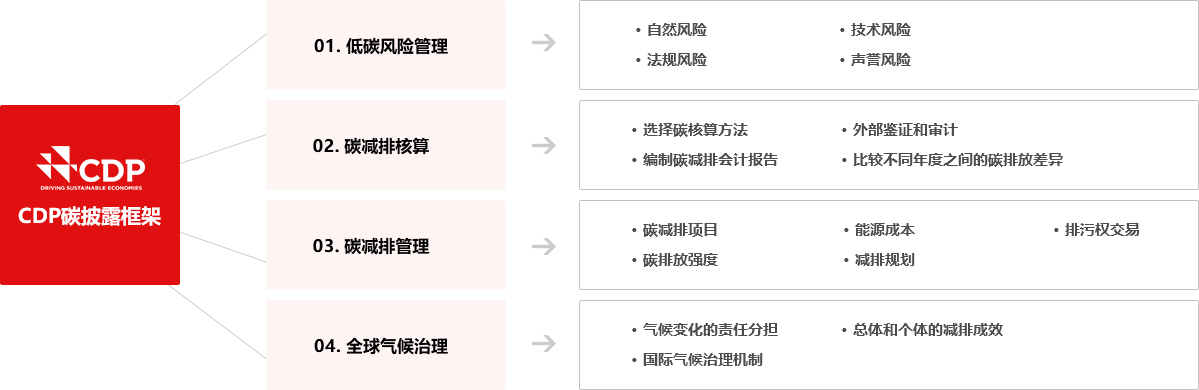 CDP在碳信息披露方面具有较为完整和权威的框架,主要包括四个方面: