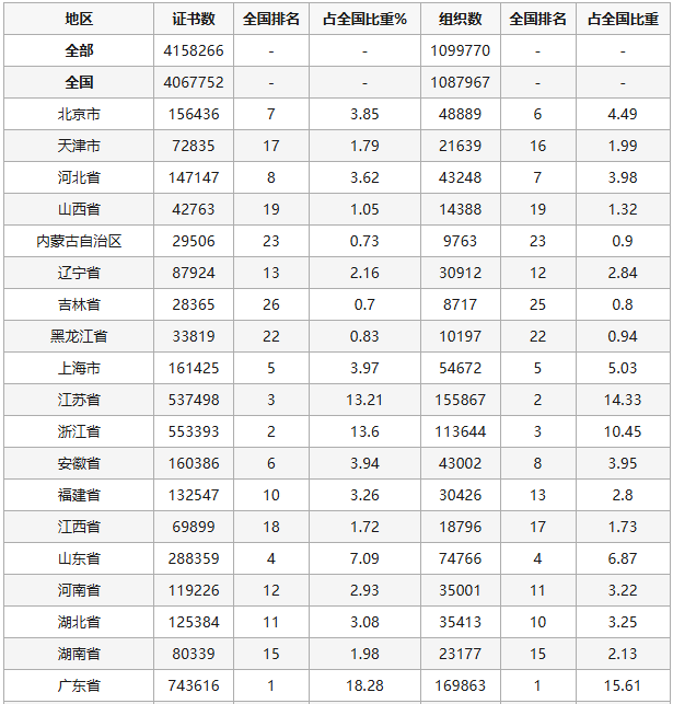 截至2024年12月,我国有效认证证书数为406万张,获证企业108万家。其中证书数10万以上的省、市有12个,分别为广东743616张、浙江553393张、江苏537498张、山东288359张、上海161425张、安徽160386张、北京156436张、河北147147张、四川137864张、福建132547张、湖北125384张、河南119226张。数据显示,从2023年12月到2024年12月,在我国12个证书数超过10万的省市中,浙江省的证书数从478,487张增加到553,393张,同比增长约15.66%,是证书数同比增长最多的省份。